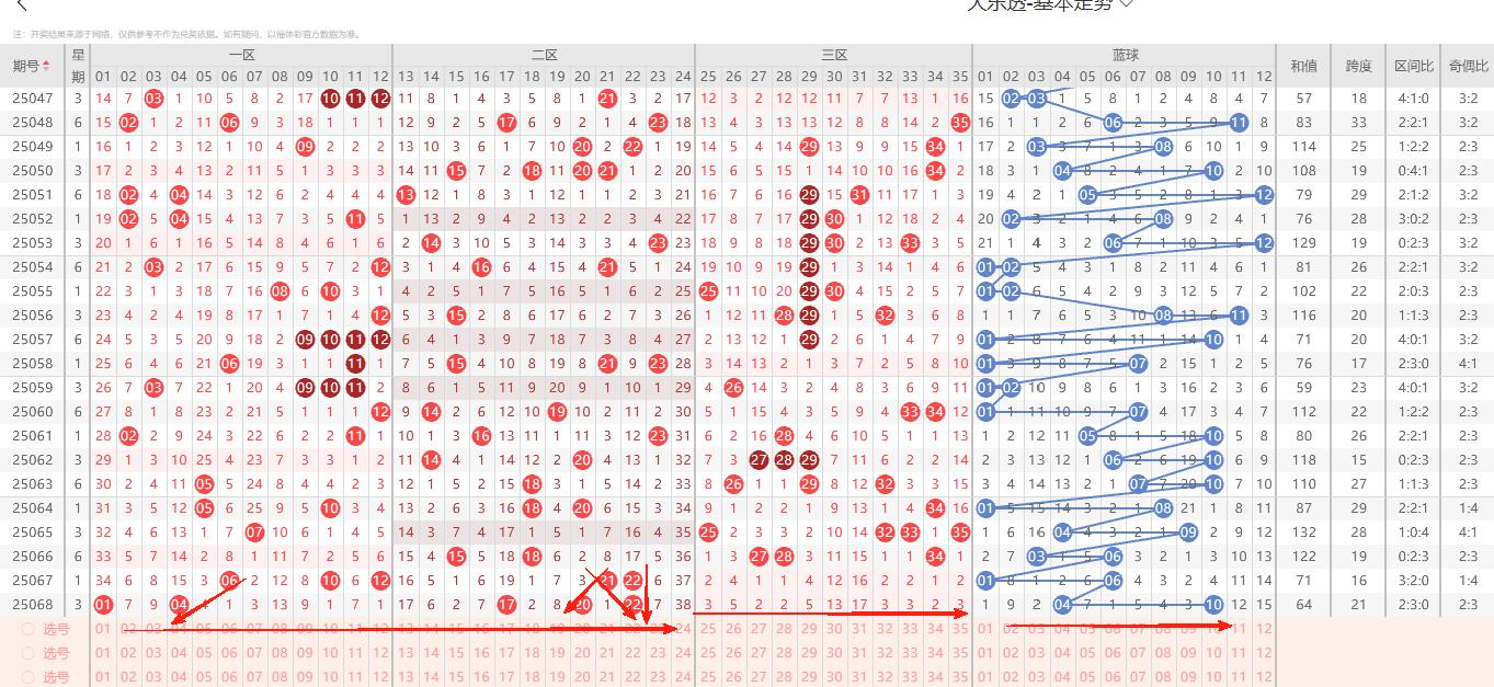 2、后区:上期开出04 10,从后区整体走势来看在大部份开奖结果中频繁有重码或者邻码的开出,根据重号出号频率本期预防03 04 05 09 10 11中有号码落下。综合后区本期关注01 03 08 11 12。有关其他具体详细号码及周期走势分析关注11:05~12:30选号思路详细解析的直播解析。