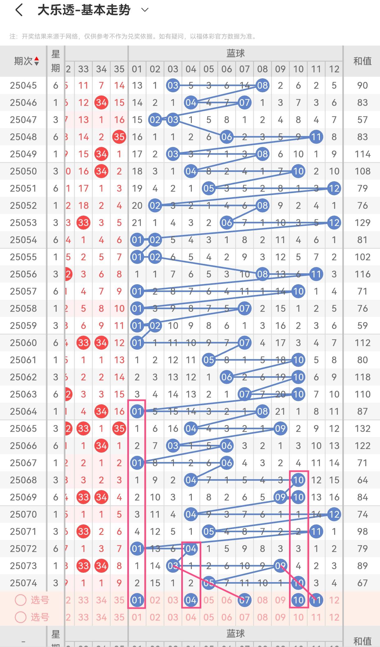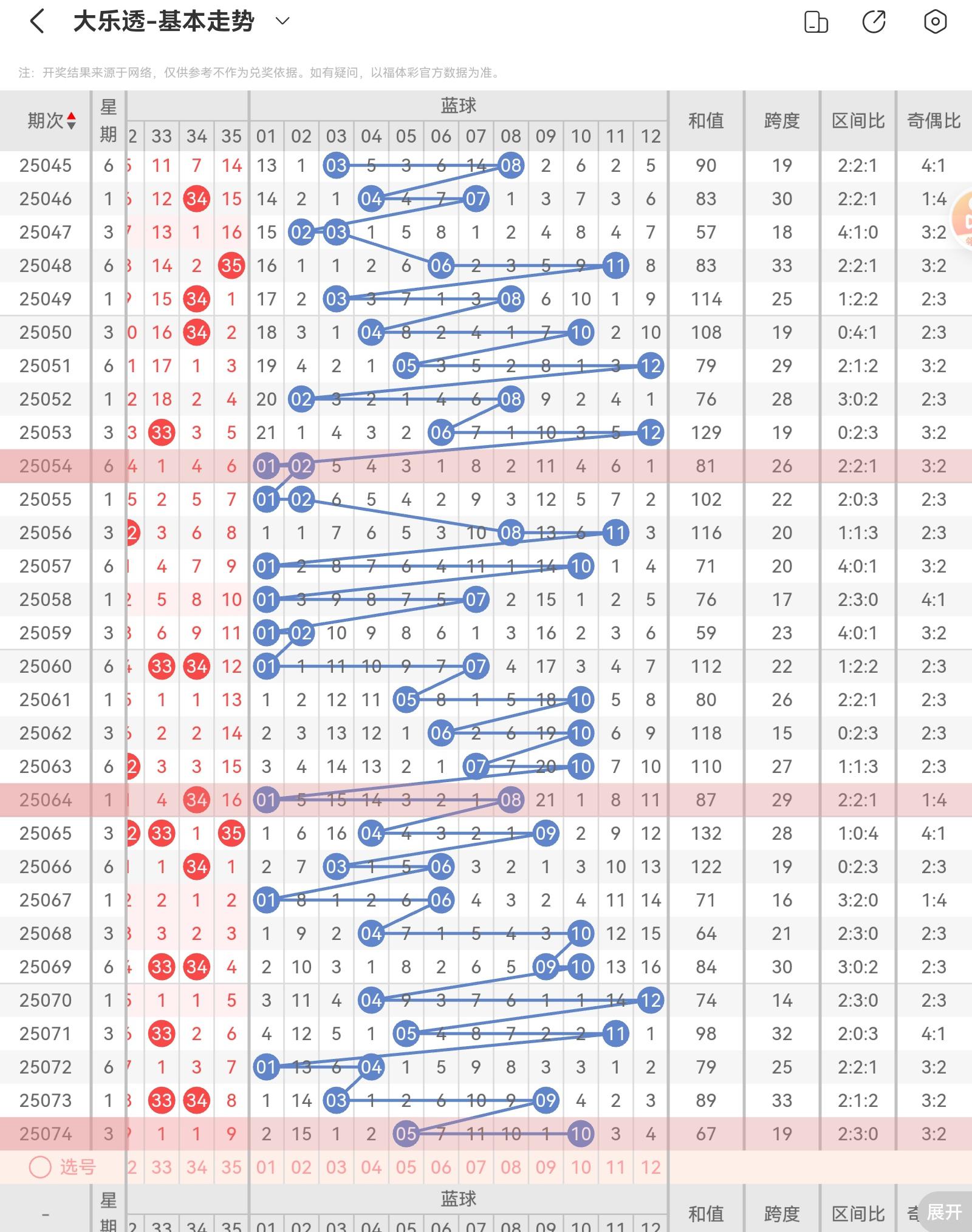 >蓝球上期(25074期)开出了05-10,开出了一奇一偶组合出号,本期需要注意是会继续开出一奇一偶组合出号还是会开出两奇或者两偶组合出号,且连续两期开出了一大一小组合出号,本期需要注意是会继续开出一大一小组合出号还是会开出两大或者两小组合出号,本期蓝球首先需要关注的号码【01】和【04】两期回补号码带对称形态,然后是【07】十一期回补号码带隔空斜连走势,其次是【10】重号对称形态,【11】三期回补号码带三斜连走势,本期蓝球重点关注号码【01 04 07 10 11】