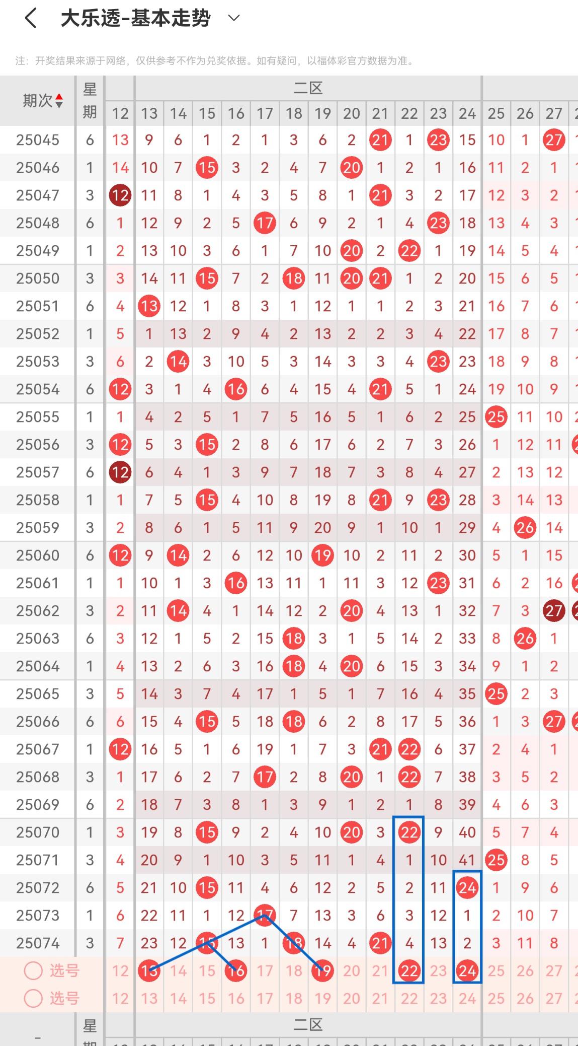 >二区间上期(25074期)开出了三码15-18-21,开出了独码和分边号码,本期做号需要注意斜连走势号码能否开出,以及独码位置能否有落码和空白区域号码回补落码,从近期该区间上开出的独码来看,在25070期开出独码后下期独码放了空,在25072期开出独码后下期独码放了空,在25073期开出独码后下期独码分了边,本期独码位置号码需要仔细研判考虑,本期首先需要关注的号码【13】二十三期回补号码带隔空斜连走势,然后是【16】十三期回补号码,其次是【19】十四期回补号码带三斜连走势,【22】四期回补号码,【24】两期回补号码,本期重点关注号码【13 16 19 22 24】