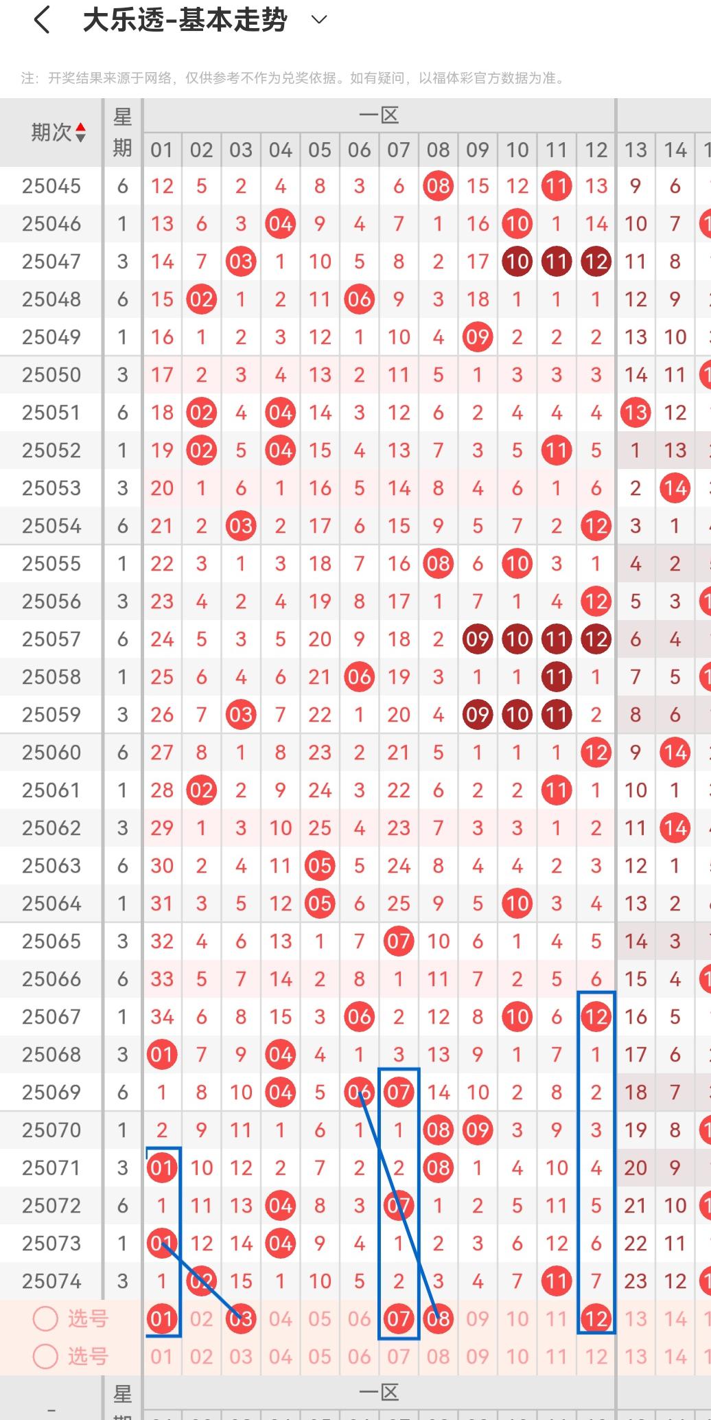 >一区间上期(25074期)开出了两码02-11,开出了分边号码和独码,本期做号需要注意独码位置能否有落码和空白区域号码回补落码,从近期该区间上开出的独码来看,在25071期开出独码后下期独码放了空,在25072期开出独码后下期独码走了重,在25073期开出独码后下期独码分了边,本期独码位置号码需要仔细研判考虑,本期首先需要关注的号码【01】隔期回补号码带对称形态,然后是【03】十五期回补号码带三斜连走势,其次是【07】两期跳空对称形态,【08】三期回补号码带隔空斜连走势,【12】七期回补号码,本期重点关注号码【01 03 07 08 12】