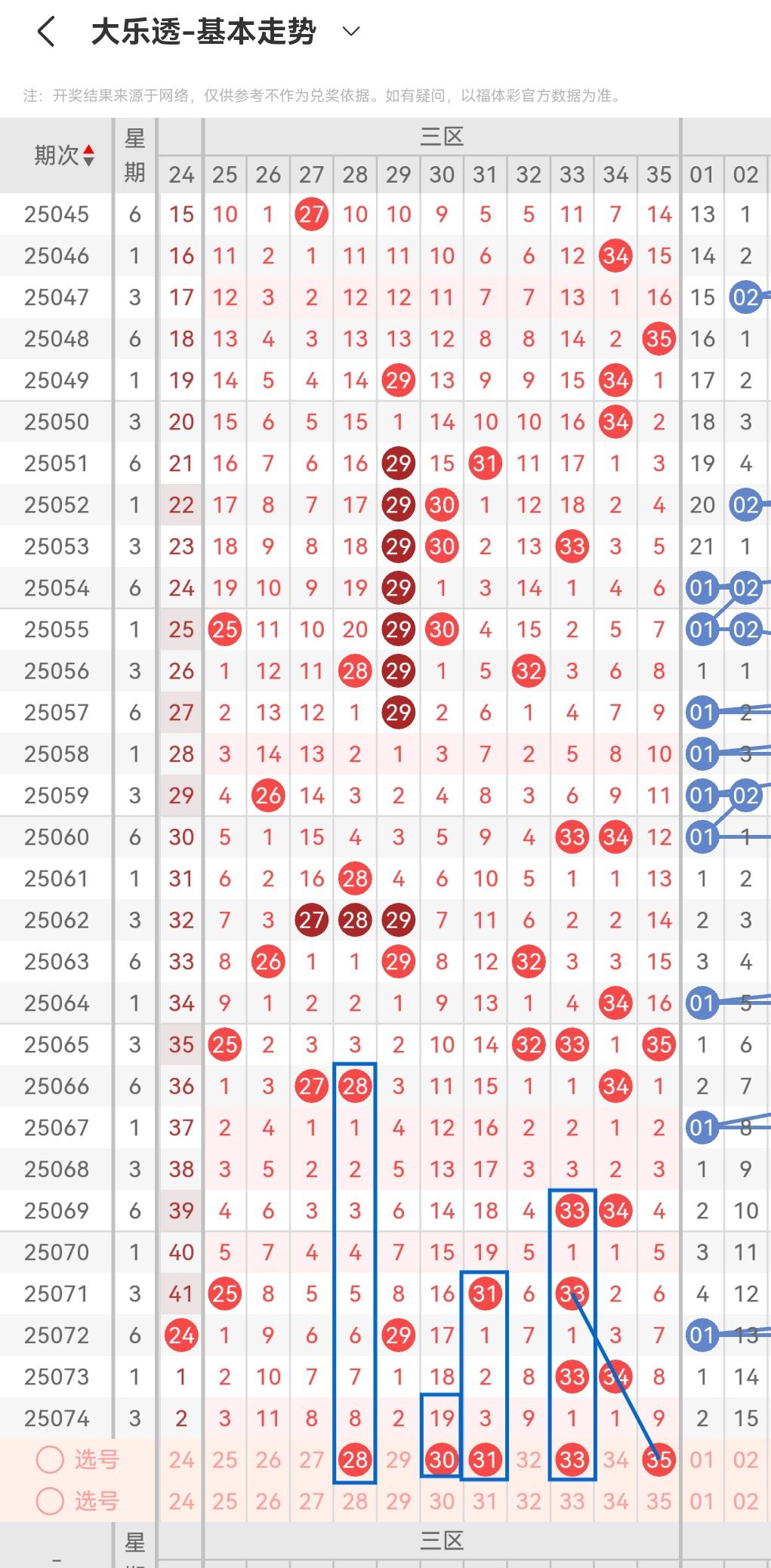 >三区间上期(25074期)开出了零码,区间走出了断区走空,本期断区走空下如何回补和能回补几码需要仔细研判考虑,重点关注近期热态和温态号码回补落码,从近期该区间走出断区走空回补来看,在25058期走出断区走空后下期回补了一码,回补了冷态号码,在25068期走出断区走空后下期回补了两码,回补了热态号码,在25070期走出断区走空后下期回补了三码,回补了冷态和热态号码,本期首先需要关注的【28】八期回补号码,然后是【30】十九期回补号码,其次是【31】三期回补号码,【33】隔期回补号码带对称形态,【35】九期回补号码带隔空斜连走势,本期重点关注号码【28 30 31 33 35】