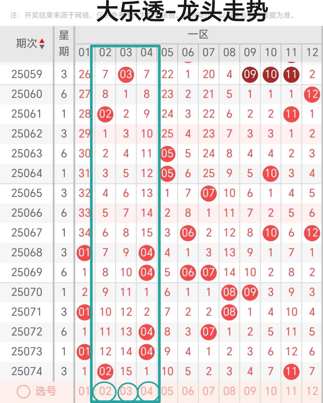 二、体彩大乐透第075期前区龙头凤尾分析