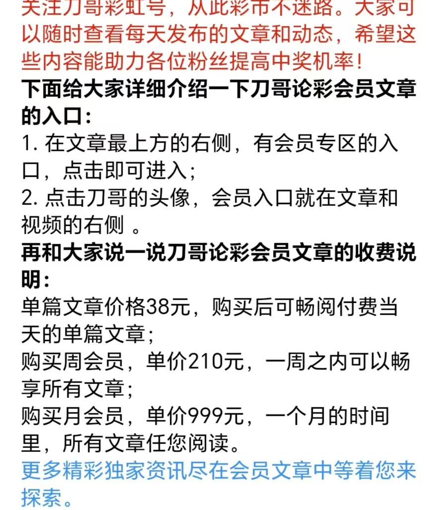刀哥会员文章的精选内容,价值满满!但只有长期跟单,才能稳稳抓住盈利时机,要是三天打鱼两天晒网,很可能错过大肉行情。大家可按需自主选择,也欢迎参考我的免费文章 ,多一种思路,多一分收获。祝大家都能在体彩大乐透里收获好运,多多中奖!
