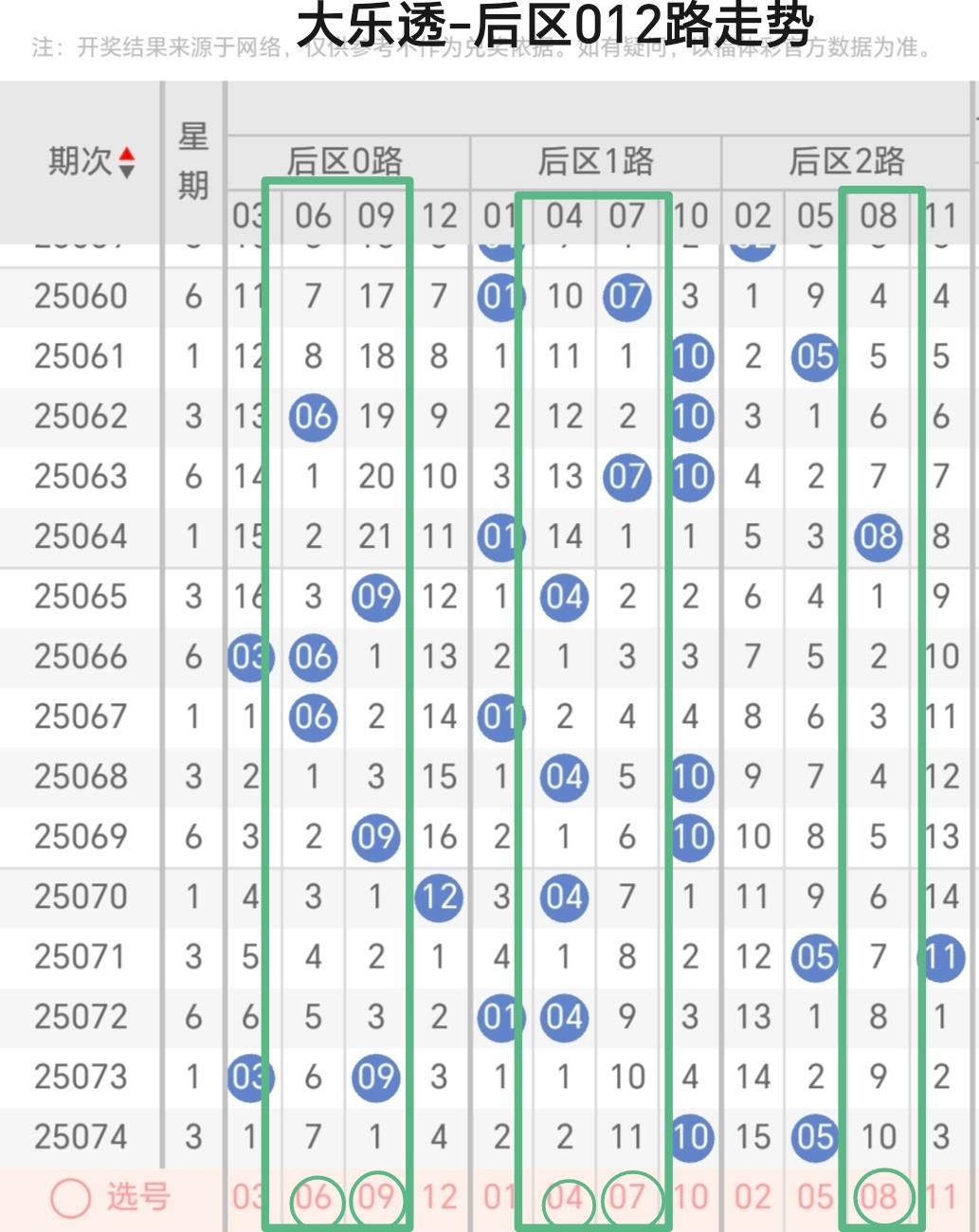 三、体彩大乐透第075期后区012路走势分析