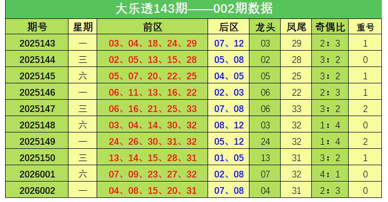 大乐透第2026002期出奖号统计:前区04、08、15、20、31,后区07、08。龙头04,凤尾31,奇偶比2:3,为开出重号。