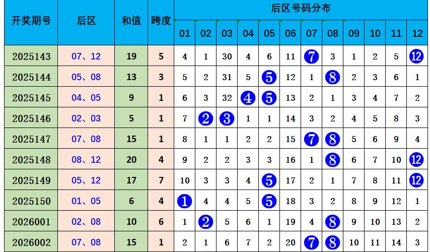 上期后区开出奖号07、08,冷热比0:2,近10期冷热比中,0:2出现6次,1:1出现4次,2:0出现0次,总体热码开出较多。综合分析,本期关注冷热比1:1。