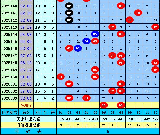 后区第二位推荐:在连续5期开奖中分别出号:12、05、08、08、04,均值为7.4,其中偶数奖号表现活跃,本期预计偶数号码继续热出,关注号码08。