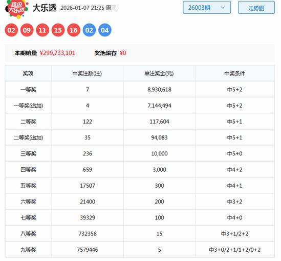 大乐透第2026003期奖号为:02、09、11、15、16+0204,其中前区奇偶比为3:2,大小比为0:5,和值为53,后区和值为6,跨度为2。