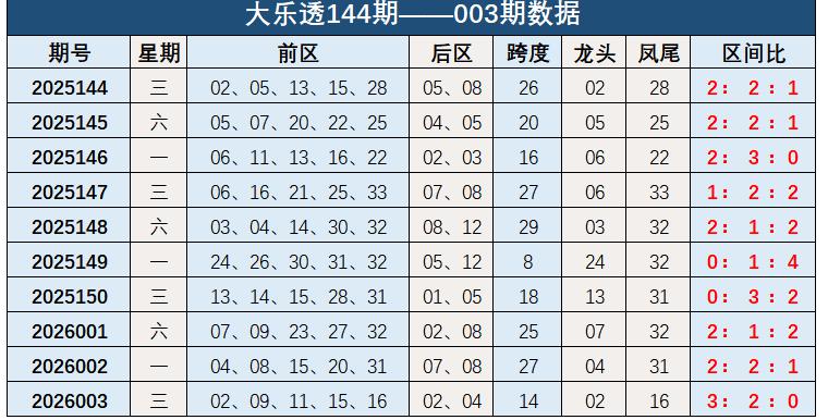 大乐透第2026003期出奖号统计:前区05、09、11、15、16,后区02、04。前区跨度14,龙头02,凤尾16,区间比比3:2:0。