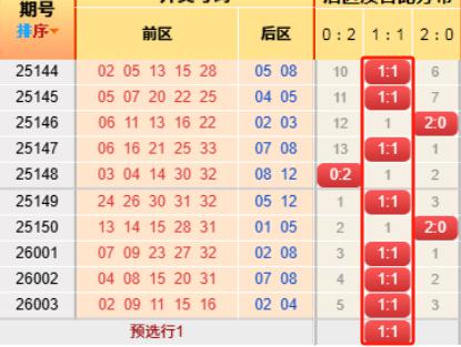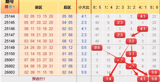 上期前区小大比5:0,新的一年新的总计3期中3期。言归正传我们继续用历史数据说话,前区小大比分成6种0:5、1:4、2:3、3:2、4:1、5:0(如图),我统计了一下历史出现次数,0:5出现107次、1:4出现514次、2:3出现978次、3:2出现813次、4:1出现355次,5:0出现54次,再看近10期小大比出现次数比为1:0:3:3:2:1,通过历史数据对比观察以及根据遗漏对称理论原则,故本期我们选择5:0、1:4、4:1;(具体精准方向请查看小车小大比精选)