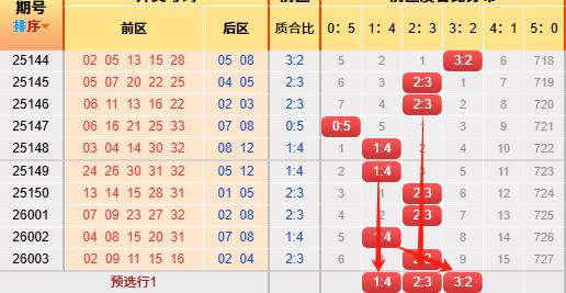 上期质合2:3,近1期中1期。来看历史次数统计0:5出现271次、1:4出现911次、2:3出现1017次、3:2出现514次、4:1出现101次、5:0出现7次,再看近十期质合比出现的次数比1:3:5:1:0:0,冷值5:0暂时放弃,再结合图形来看,本期趋势看顺路,初步选择为2:3、1:4、3:2。(具体请点击本条上车查看精选质合比)