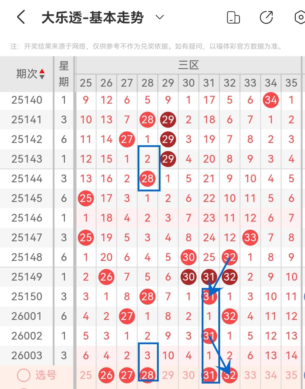上一期三区出现了断区的情形,本期三区连续断区的可能性小,本期三区出号数量可以考虑1-2个;本期三区需要关注的号码:26-27-28可能会有号码开出;31为隔期码;31-32可能会一起落号;因此本期三区选号应该考虑26-27-28-31-32等号码。