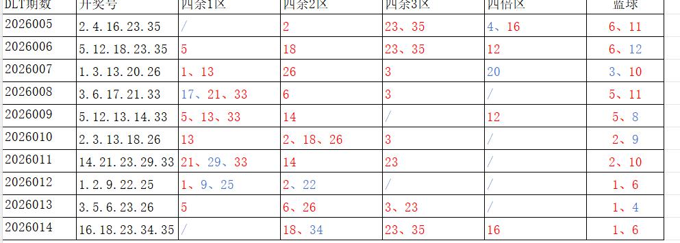 分享第一个数据分析:四分区统计数据。相对于传统的三分区,个人习惯使用四分区,就是把35个红球号码除以4,所得的余数分区如下: