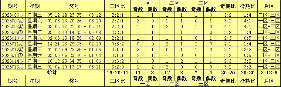 前区三区走势:上期前区奖号三区比为3:2:0,最近10期前区奖号三区比为19:20:11。