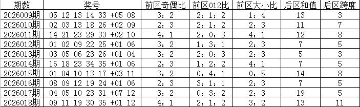 012路分析:上期前区奖号012路比为2:1:2,最近两周0路前区奖号表现较冷。