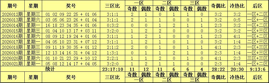 前区三区走势:上期前区奖号三区比为3:2:0,最近10期前区奖号三区比为23:17:10。