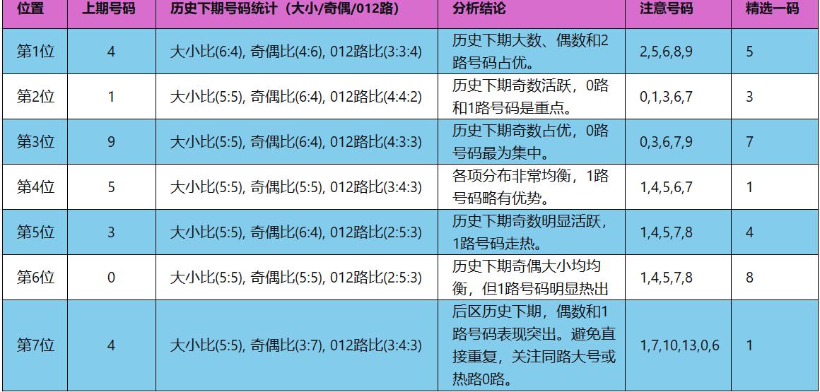 此分析针对第25141期奖号4、1、9、5、3、0 + 4,查找历史上该位置开出相同号码后,其下期奖号的规律。