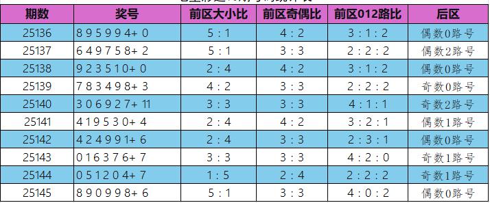 大小比:近10期大小比为5:1,5:1,2:4,4:2,3:3,2:4,2:4,3:3,1:5,5:1。大数总数32个,小数28个,大数仍占优但波动剧烈。