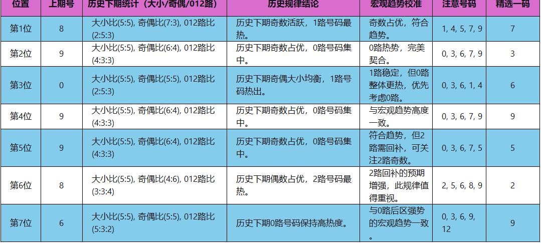 此分析针对第145期奖号8、9、0、9、9、8 + 6,查找历史上该位置开出相同号码后,其下期奖号的规律,并结合当前宏观趋势进行校准。