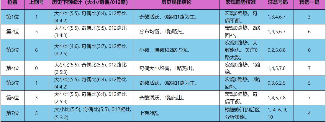 后区推荐:1, 4, 6, 9, 10。此组合包含:热号6;温号0的替代(关注同路大号9);1路关注号1、4、10;兼顾了近期均衡态势和各路回补可能。