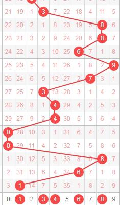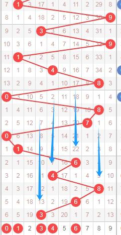 上图是体彩七星彩开奖号码分布图从左到右的第四位数字,我在上图中标注出来的数字是觉得可以关注的,因为关注这几个数字?看看我画的蓝色箭头就会发现,最近开出的跨度大的走势多,那么本期我觉得应该关注跨度小的数字,所以关注数字0 1 2 3 4。