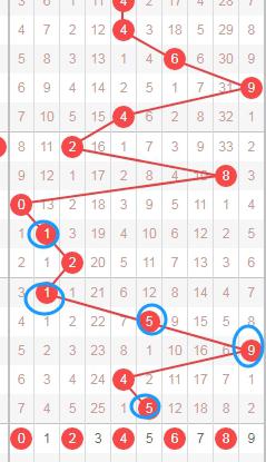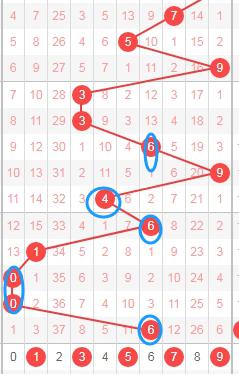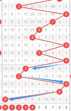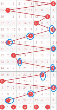 上图是体彩七星彩开奖号码分布图从左到右的第三位数字,我在上图中标注出来的数字是觉得可以关注的,标注出来的数字是所有奇数,因为最近开出的偶数比较多,上面我用蓝色圈圈标注出来的都是偶数,那么上面偶数多,那么本期奇数的概率大,关注数字1 3 5 7 9。