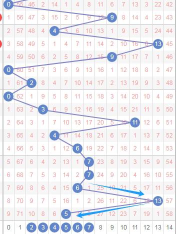 上图是体彩七星彩开奖号码分布图从左到右的第六位数字,我在上图中标注出来的数字是觉得可以关注的,因为这几个数字的遗漏周期小,我在上面图中用蓝色箭头标注出来的数字,你们看看这些遗漏周期是不是大,那么本期关注遗漏周期小的数字0 1 3 4 6。