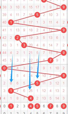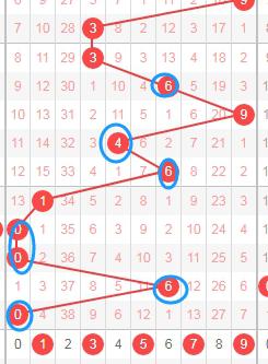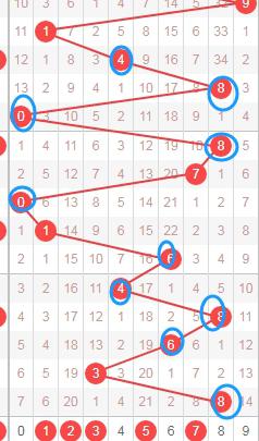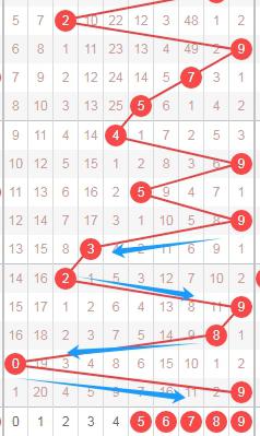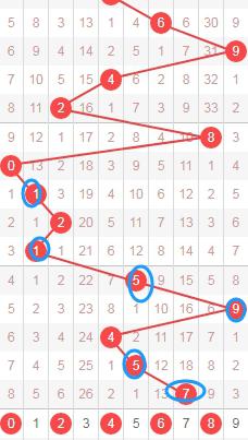 上图是体彩七星彩开奖号码从左到右定位的第二位数字分布图,上图中标注的数字是个人觉得可以关注的。看上图中蓝色小圈圈里面的数字是奇数,最近奇数出号码多,那么本期个人觉得可以关注出偶数0 2 4 6 8。关注0 2 6。