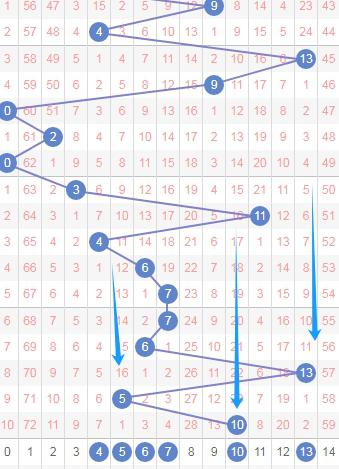 上图是体彩七星彩开奖号码从左到右定位的第七位数字分布图,上图中标注的数字是个人觉得可以关注的。看上图中蓝色箭头表示的最近开出的遗漏周期,最近三期开出的遗漏周期大,那么本期个人觉得关注遗漏周期小的数字4 5 6 7 10 13,减少一下可以关注4 6 10。