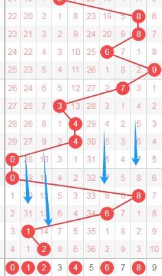 上图是体彩七星彩开奖号码从左到右定位的第一位数字分布图,上图中标注的数字是个人觉得可以关注的。看蓝色箭头会发现最近开出的遗漏周期大,那么本期关注遗漏周期小的数字0 1 2 4 6 8。个人觉得可以关注0 4 6 8。