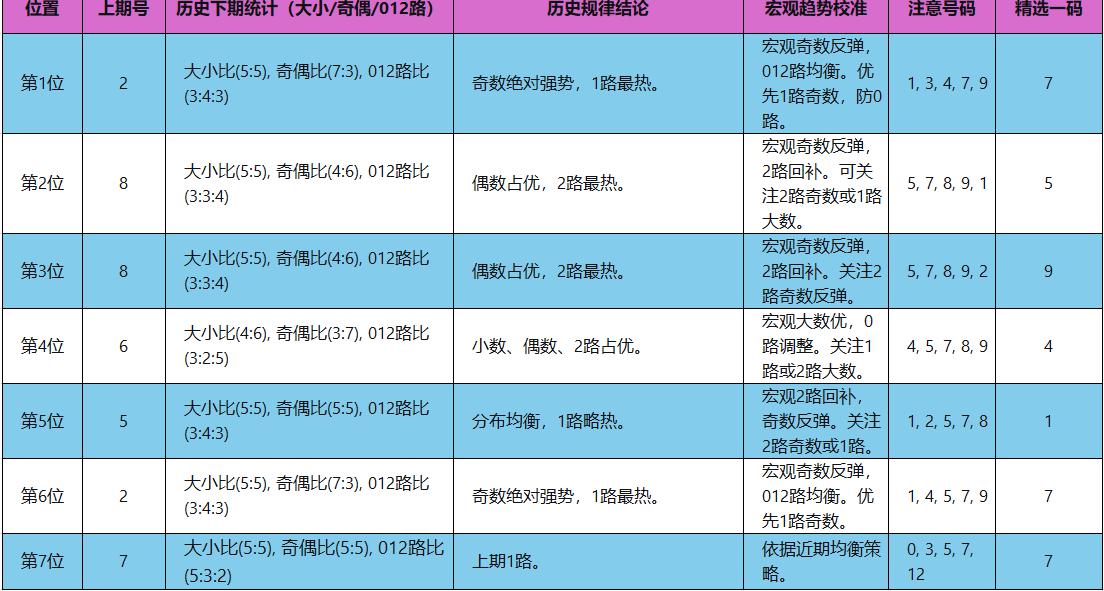 本期策略:在近期均衡的格局下,不预设主导路数。重点关注温热号的延续(如5,7)及冷号(如0,3,9)的反弹。上期开出1路7。