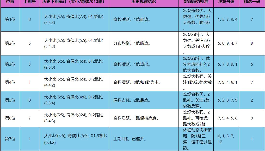 本期策略:在完全均衡的格局下,不预设任何路数优势。重点关注:①温热号的延续;②冷号(尤其是0路冷号)的反弹。上期连开1,需防其形成三连。