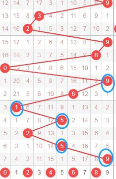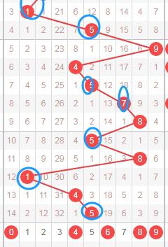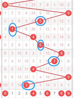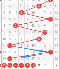 上图是体彩七星彩开奖号码分布走势图中从左到右定位的第六位数字,我在上面标注出来的数字是觉得可以关注的,因为你们看上面走势图中标注出来的蓝色箭头,最近开出的跨度都是大的,本期个人觉得这位数字应该关注出小跨度数字,这些数字是0 1 2 3 4 5。