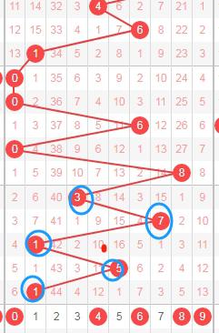 上图是体彩七星彩开奖号码分布走势图中从左到右定位的第三位数字,我在上面标注出来的数字是觉得可以关注的,因为你们看上面画出来的蓝色圈圈那些都是质数,最近连续开出了5期质数,那么本期个人觉得应该关注这位数字出合数0 4 6 8 9。