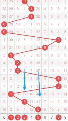 上图是体彩七星彩开奖号码分布走势图中从左到右定位的第一位数字,我在上面标注出来的数字是觉得可以关注的,因为你们看我画出来的蓝色箭头表示的遗漏周期,上期开出数字5遗漏周期是41期,那么前面开出遗漏周期大的走势,本期个人觉得应该可以去关注遗漏周期小的数字1 2 3 5 7。