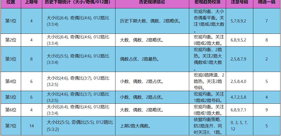 3. 本期指标推演:奇偶比推荐:3:3。长期基本平衡,近期偶数略优,但上期偶数(4个)占优后,本期看好奇偶回归均衡。大小比推荐:3:3。长期大数占优,但近期大小数几乎持平,预计延续均衡态势。012路比推荐:2:2:2。在近期0、1、2路首次形成35%:30%:35%的均衡格局后,看好各路号码继续均衡开出,这是对趋势的确认和追随。和值参考:24-32。上期和值32较高,本期可能小幅回落。跨度参考:6或7。关注中等跨度。