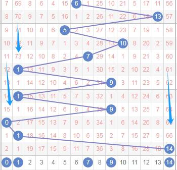 这是体彩七星彩开奖号码从左到右定位的第七个数字走势图,我在上面标注出来的数字0 1 7 9 14个人看好这几个数字,因为你们看上面画出来的蓝色箭头表示的就是最近开出的遗漏周期,上期开出数字是14遗漏周期66期,本期关注这位数字遗漏周期走小,看好数字0 1 7 9 14。