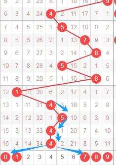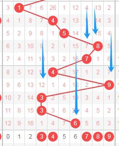 这是体彩七星彩开奖号码从左到右定位的第三个数字走势图,我在上面标注出来的数字5 6 7 8 9个人看好这几个数字,因为你们看上面画出来的蓝色箭头表示的就是最近开出的走势跨度,上期开出的跨度是数字1到数字8跨度是7,看上面蓝色箭头就知道最近开出的跨度大的为主,本期关注这位数字出小跨度,于是就关注数字5 6 7 8 9。