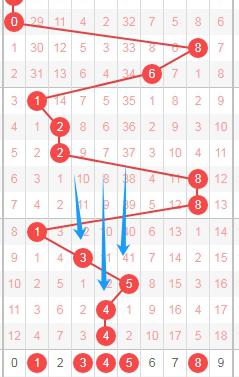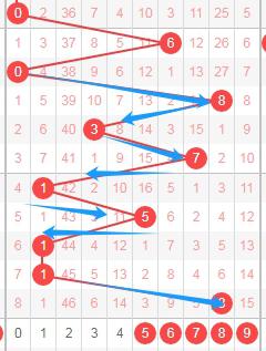 这是体彩七星彩开奖号码从左到右定位的第一个数字走势图,我在上面标注出来的数字1 3 4 5 8个人看好这几个数字,因为你们看上面画出来的蓝色箭头表示的就是最近开出的遗漏周期,上面连续三期开出的遗漏周期大,尤其数字5的遗漏周期是41期,那么本期个人观点就是留意遗漏周期小的数字1 3 4 5 8。