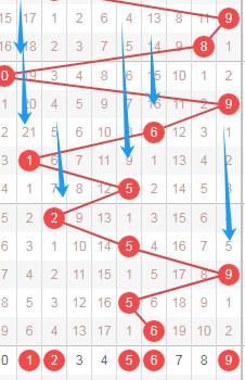 这是体彩七星彩开奖号码从左到右定位的第四个数字走势图,我在上面标注出来的数字1 2 5 6 9个人看好这几个数字,因为你们看上面画出来的蓝色箭头表示的就是最近开出的遗漏周期,上面开出的遗漏周期大的为主,那么本期个人观点就是留意遗漏周期小的数字1 2 5 6 9。
