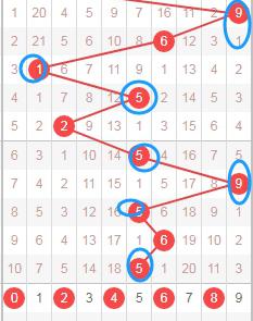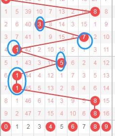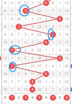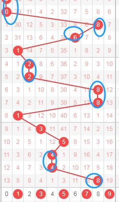 上图是体彩七星彩从左到右定位中第三位数字的走势图,我在上面走势图标注的数字都是合数0 4 6 8 9是我看好的,因为你们看上面走势图中标注出来的蓝色圈圈都是质数,最近几期这位数字开出的质数多,合数少,所以本期个人观点这位数字关注合数0 4 6 8 9。