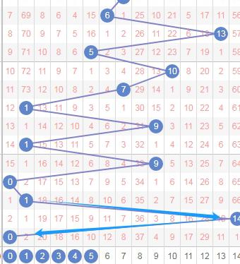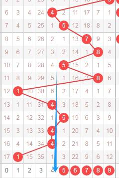 上图是体彩七星彩从左到右定位中第七位数字的走势图,我在上面走势图标注的数字0 1 2 3 4 5是我看好的,因为你们看上面走势图中标注出来的两根蓝色箭头,最近连续开出的两期大跨度走势,那么本期关注这位数字出小跨度,小跨度的话那么就是0 1 2 3 4 5这个区域。