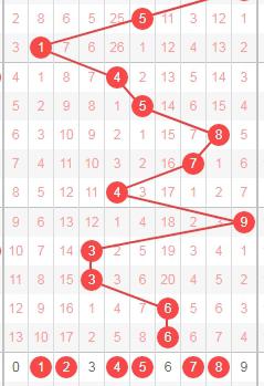上图是体彩七星彩从左到右定位中第五位数字的走势图,我在上面走势图标注的数字都是1 2 4 5 7 8我看好的,因为最近这位数字开出的都是0路球数字,连续5期开出的都是0路球数字,本期这位数字个人不看好0路球数字,所以看好1路球和2路球数字1 2 4 5 7 8。