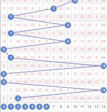 从大小跨度来分析,上图是体彩七星彩开奖号码走势图中从左到右第七位,最近第七位数字开出的跨度都大,连续开出的跨度大,开出的跨度小的次数少,那么本期这位数字关注出小跨度,出小跨度的话,那么范围就是0123456。