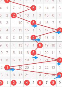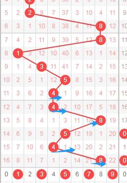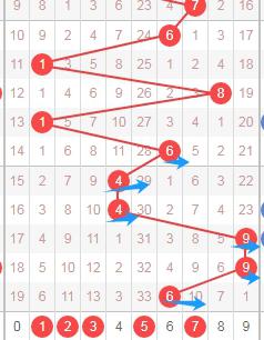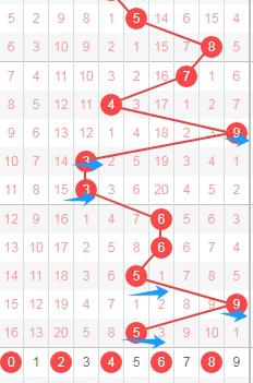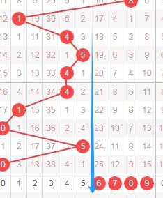 从冷热号码区域来分析,上图是体彩七星彩开奖号码走势图中从左到右第二位,我在上面标注出来的数字6789当成一个区域,看上面走势图中标注出来的蓝色大箭头就知道,最近蓝色大箭头的左边开出的号码多,右边开出的号码少,那么本期这位数字个人观点看好右边数字6789。