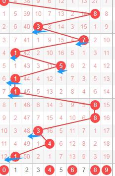 从质数和合数来分析,上图是体彩七星彩开奖号码走势图中从左到右第三位,我在上面标注出来的数字都是合数04689,看上面走势图中标注出来的蓝色小箭头就知道,最近开出的质数多,开出的合数少,那么本期这位数字个人观点看好合数04689。