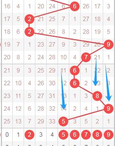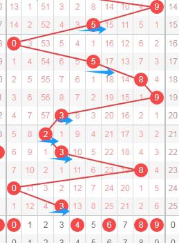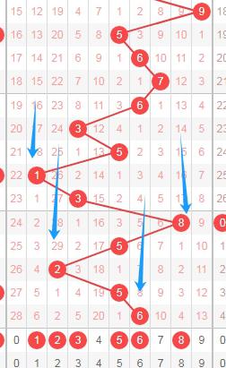上图是体彩七星彩从左到右定位分析第五位数字走势图,我在上面走势图中标注出来的蓝色箭头表示的就是遗漏周期,这个遗漏周期最近开出的都是大的,那么本期可以关注遗漏周期小的数字123568,个人最看好数字2356。