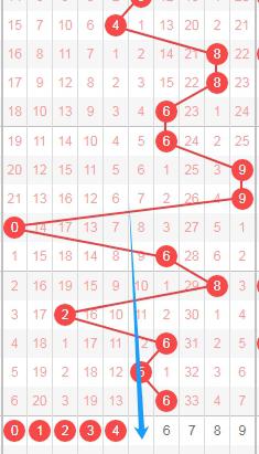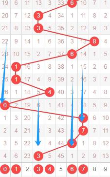 上图是体彩七星彩从左到右定位分析第六位数字走势图,我在上面走势图中标注出来的蓝色箭头表示最近开出的遗漏周期,上期开出数字3遗漏周期是8期,最近开出遗漏周期大的数字有好几个,那么本期第六位数字可以关注出遗漏周期小的数字013467,个人最看好数字067。