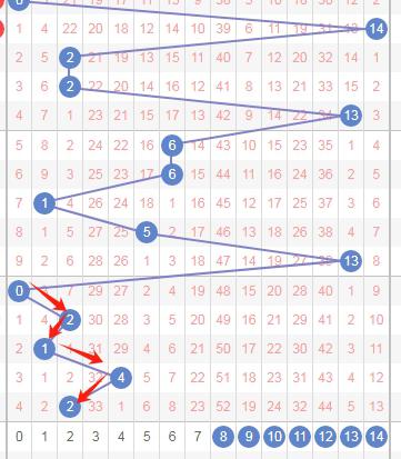 上图是体彩七星彩蓝球开奖号码走势分布图,我在上面走势图中标注出来的数字是我觉得可以看的范围,你们看看上面走势图中标注出来的红色箭头最近几期开出的蓝球跨度都是小跨度,走小跨度一直走了4期,那么本期开出大跨度的走势的机会就大了,假设本期开出大跨度的数字的话,那么上面走势图中标注出来的数字8 9 10 11 12 13 14可以看成本期蓝球号码范围。最看好数字8 10 11 12。