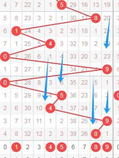 上图是体彩七星彩从左到右定位第二位数字走势图,我在上面走势图中标注出来的蓝色箭头表示遗漏周期,上面数字8遗漏周期是8期,从这个遗漏周期来分析,本期不看好遗漏周期大的数字,那么本期可以关注出遗漏周期小的数字14589,个人最看好458。